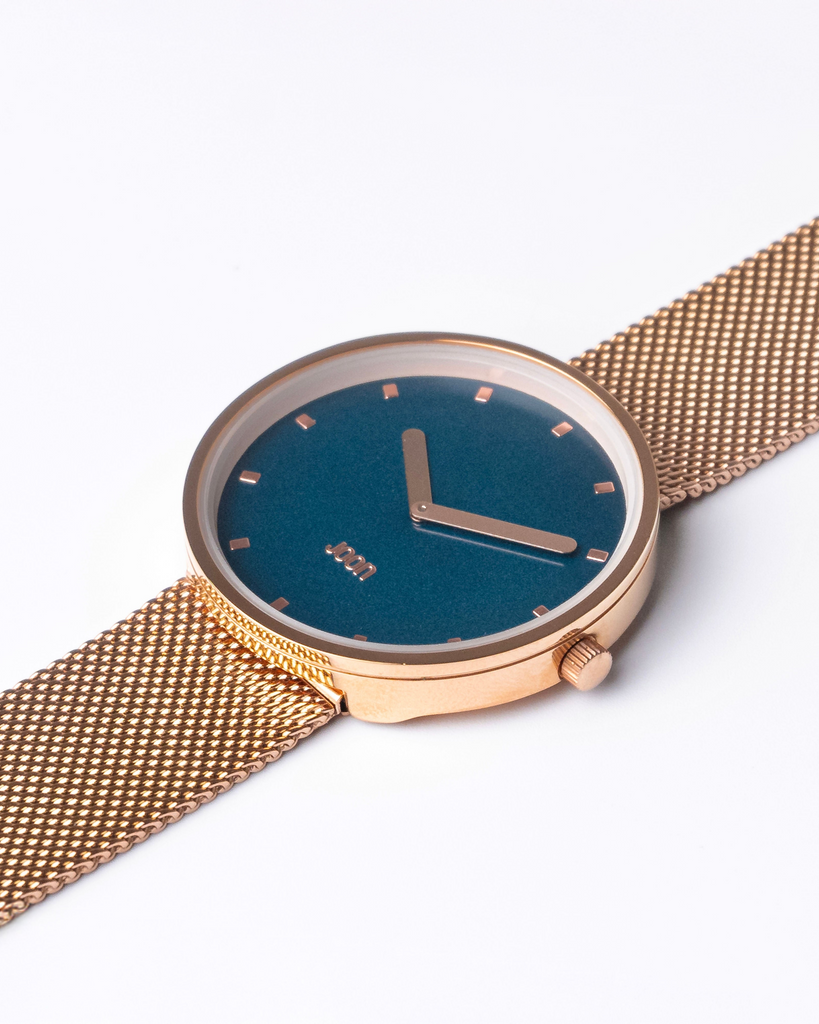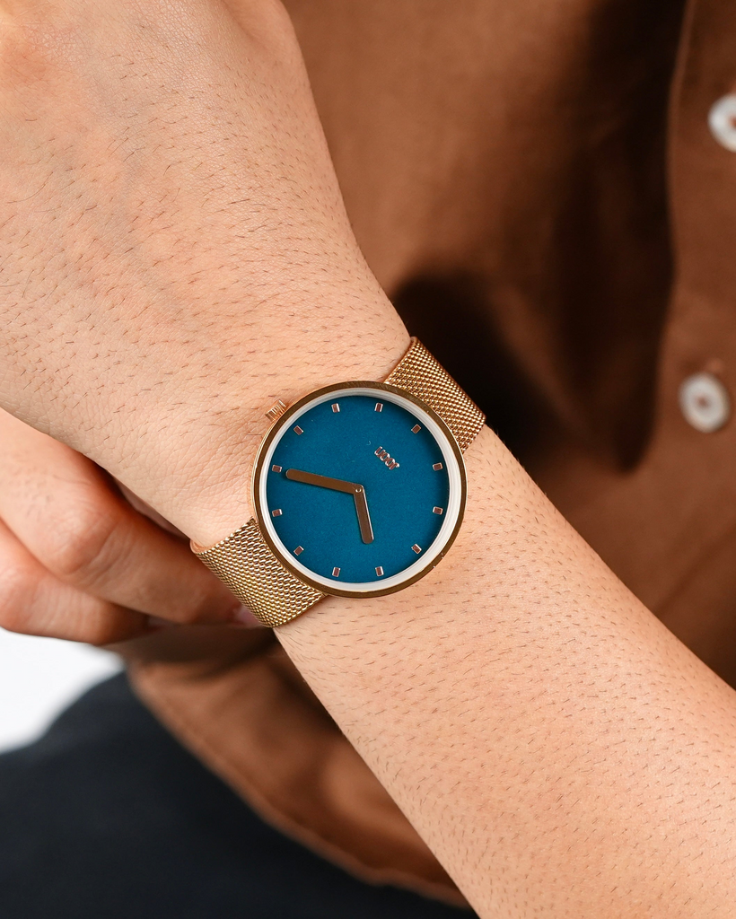 Introducing Socialite - a watch that celebrates the everyday heroes and the beauty in ordinary moments. With a teal blue dial that sparkles like the ocean and a rose gold case that shimmers like the sun, this timepiece is a testament to the beauty in simplicity. Whether you're running errands, attending a family gathering or simply enjoying a cup of coffee at your favorite spot, the Socialite is the perfect companion that adds a touch of sophistication to your everyday life.